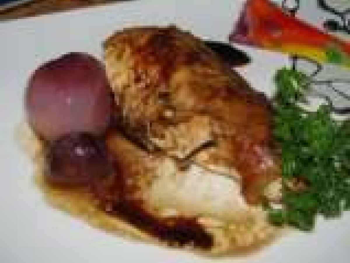 Pui la cuptor cu rozmarin, otet balsamic si ceapa rosie
