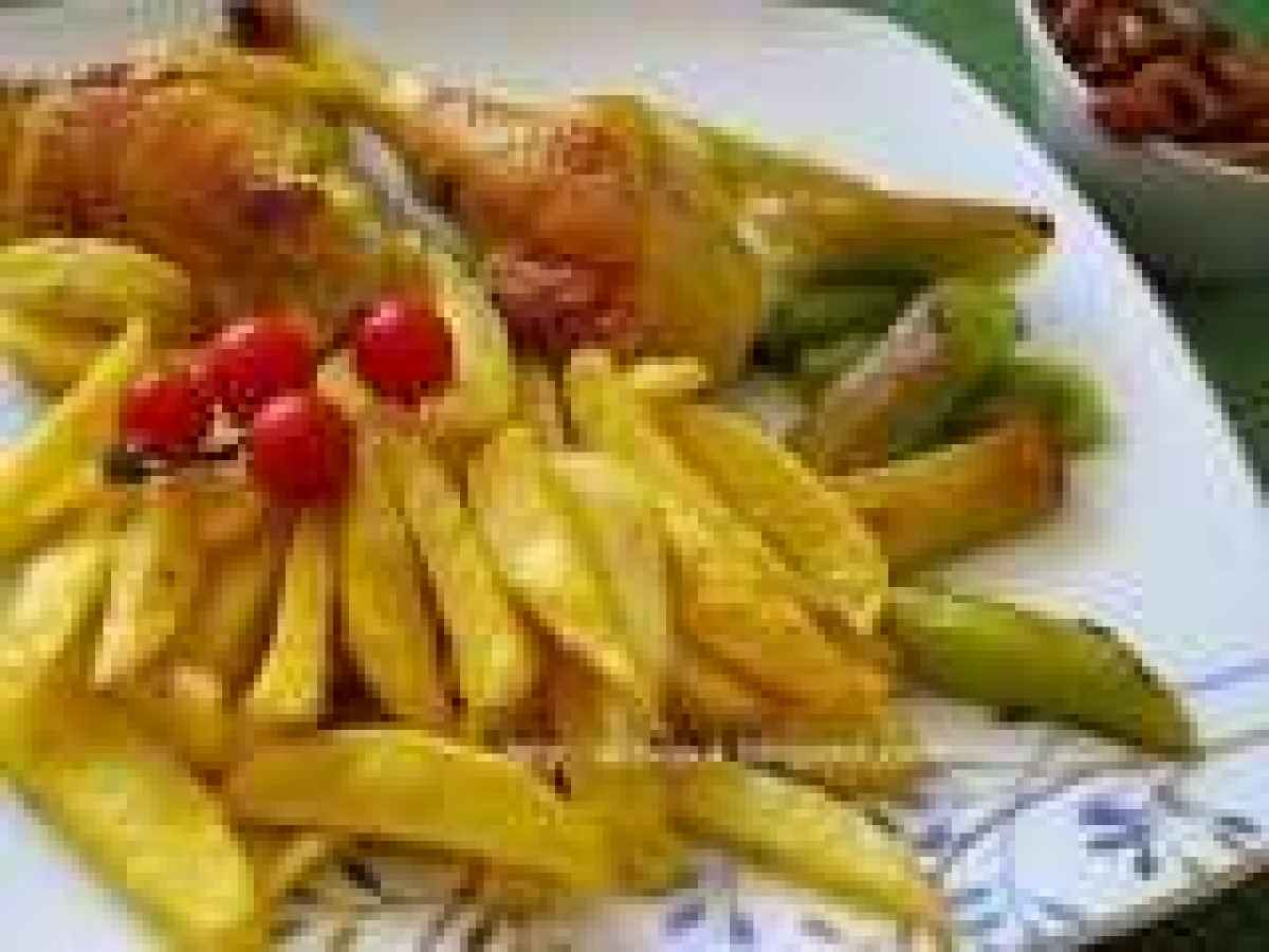 Separat cur??a?i cartofii de coaj?, îi sp?la?i ?i-i t?ia?i în lung. Ace?tia se pr?jesc în ulei încins.