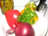 Ingrediente: 1 ardei gras rosu, taiat felii subtiri 1 ardei gras galben, taiat felii subtiri 1/4 ceapa rosie, felii subtiri 3-4 ardei iuti murati, feliati (se...