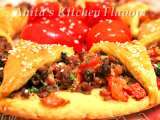 Ingrediente: Pentru aluat : 3 dl faina 125 g unt 3 linguri apa Pentru umplutura : 140 g bacon 500 g carne tocata 1 ceapa 2 ardei rosii mari sau 3 mici 1...