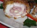 Ingrediente: * 2 bucati de piept de pui dezosat * 20 felii de cascaval * 10 felii de sunca (muschi sau sunca presata) * 3 oua * Sare si piper dupa gust * 300g...