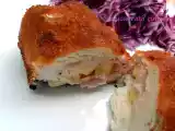 Ingrediente: 1 kg de piept de pui,3 oua,200 grame de pesmet alb,2oo ml ulei,faina,sare,piper,mustar,castraveti murat si gogosari,parizer traditional si cascaval.