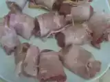 Ingrediente: 300 g piept de pui 8 felii de bacon 200 g de cârnăciori 1 dovlecel mai mare 1 păhărel de vin alb 2 căței de usturoi 2 crenguțe de cimbru 3 frunze...