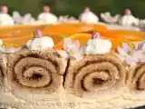 Ingrediente: Pentru rulada: 4 oua 3 linguri apa rece 80 g. zahar 70 g. faina 50 g. migdale macinate cateva picaturi esenta portocale 50 g. coaja de portocala...