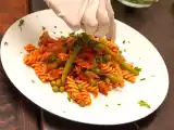 Ingrediente: 400g paste integrale 1 ceapa de apa 2 buc bete de telina 100g boabe de mazare 100g pastai de fasole verde 6 rosii cherry 6 frunze de busuioc 200g...