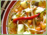 Ingrediente: 1 morcov o albitura jum telina 8 cartofi o ceapa mare 1 ardei gras sau capia 2-3 linguri tarhon verde o lingura frunze de telina tocate 3 catei de...