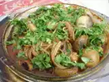 Ingrediente: 4 pulpe de pui spalate si sterse 2 cepe medii curatate si spalate 3 rosii spalate 6 catei mici de usturoi curatati si spalati Un pahar de vin rosu...