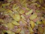 Ingrediente: 1 kg carne de porc, 1 kg cartofi, 2-3 catei de usturo 2oo ml vin alb, 200 ml ulei, 1 ceasca cu apa,sare,piper, cimbru, marar si patrunjel.