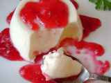 Ingrediente: 300 ml lapte 200 ml frisca lichida 3 foi de gelatina (6 g) esenta de vanilie 120 g zahar Pentru sosul de zmeura: 200 g zmeura 2 linguri zahar pudra