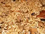 Ingrediente: 200 g ciuperci intregi (conserva) 100 ml sos de soia 50 g unt 100 g orez brun 50 g masline 1 buc ghimbir 2 linguri patrunjel uscat sare, piper