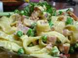 Ingrediente: 200 g paste 100 g sunca ceapa mica 2 catei de usturoi 100 g mazare scursa putin unt ulei de masline 50 ml supa 50 ml smantana marar tocat sare piper