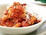 Ingrediente: 250 g paste fierte 1 conserva de rosii decojite -400 g 200 g bacon taiat cubulete marunte o priza de piper 5 crengute de busuioc 3 prize de...