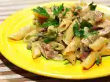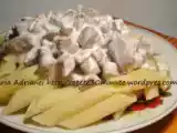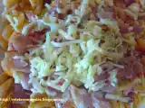 Ingrediente: paste fierte pentru 2 persoane 1/2 canita de telemea 1/3 canita vin alb 3 felii de bacon 3 felii de pastrama piept de pui afumat 1/2 canita...