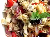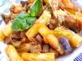 Ingrediente: 250 g paste, de tip penne rigate sau mezze maniche 600 g vinete 800 g rosii 250 g cascaval parmezan razuit 2 oua 1 ceapa frunze de busuioc oregano...