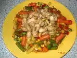 Ingrediente: 1 piept de pui mare dezosat o ceapa mica un ardei gras rosu 6-7 ciuperci mari patrunjel verde 2 lingurite delikat o lingurita condimente...