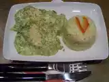Ingrediente: 500 g piept de pui dezosat 50 g unt 200 ml smantana lichida pentru gatit 75 ml vin alb sec 12 g faina 1 galbenus patrunjel verde marar verde sare