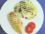 Ingrediente: 300 g piept de pui 8 felii de bacon 200 g de cârnăciori 1 dovlecel mai mare 1 păhărel de vin alb 2 căței de usturoi 2 crenguțe de cimbru 3 frunze...