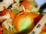 Ingrediente: 200g Piept de pui dezosat 250 ml Suc de mandarină Un ardei verde mic şi un ardei rosu mediu O ceapă albă mică şi o ceapă roşie mică O jumătate de...