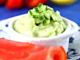 Ingrediente: 1 avocado bine copt zeama de la 1/2 lamaie 1/2 l-ta mustar ulei presat la rece de floarea soarelui sare 1-2 castraveti de gradina 1 ceapa verde