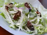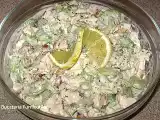 Ingrediente: branza si telina aveti nevoie de: 50 grame de branza de vaci 2 fire de telina 90 grame de mere tocate marunt 23 de grame de nuci salata verde zeama...