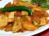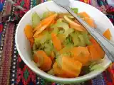 Ingrediente: 500 g cartofi, 500 g țelină, 2 cepe, 50 ml ulei, 1 linguriță praf chilli, 2 ardei iuți verzi, o conservă cu roșii, o legătură mărar, sare, piper.