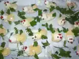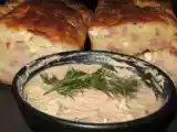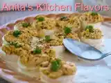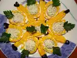 Ingrediente: 6 oua fierte tari, 150 g telemea de oi, 2 lg de smantana, 2-3 codite de ceapa verde. Pt. crema de somon: 150 g somon afumat, 100 g unt, 1 lg zeama...