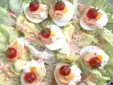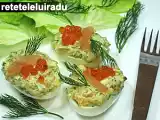 Ingrediente: 6 oua mari, fierte tari 75 g felie de somon afumat, tocata marunt 2-3 lingurite de icre de somon 5 linguri de maioneza 1 lingurita de mustar iute...