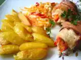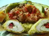 Ingrediente: 2 piepti de pui dezosati mari,100 g pastrama sau muschi file,2 ardei capia,5 ciuperci medii,2 rosii,3 fire cepa verde,1 fir usturoi verde,delicat,...