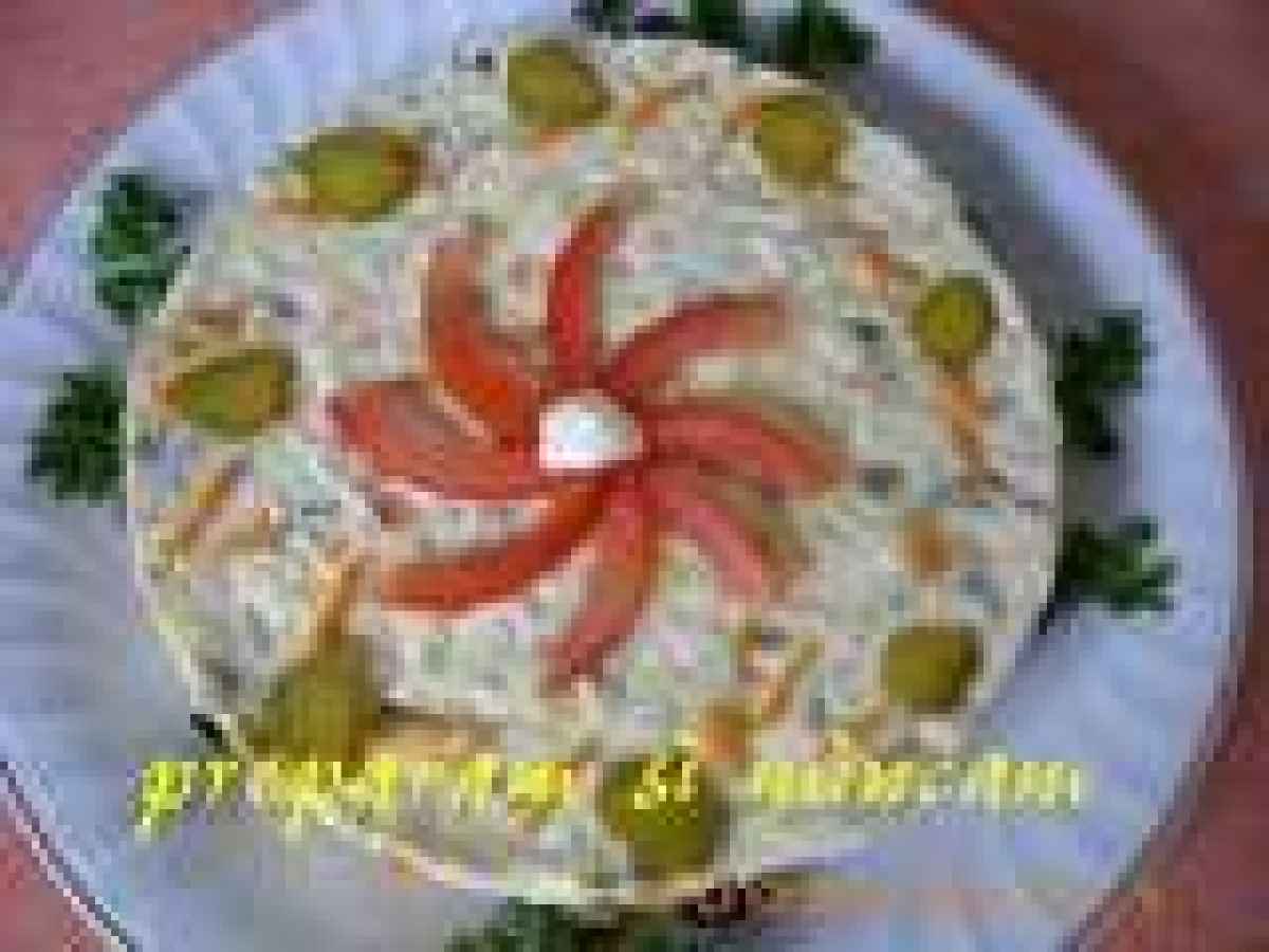 Si gata, asta e salata mea. I-am dat forma rotunda, iar cum Isabella a spus ca seamana cu un tort, a zis sa-i fac si un soare/floare. E decorata destul de simplu, ca la asta mai am de lucrat si am servit-o alaturi de bunatatile din farfuria alaturata, iar in bolurile mici am servit salata de gogosari cu suc de rosii, rosii uscate conservate in ulei si vinete conservate, rosiile si vinetele le-am primit de la rudele sotului. Pofta mare !