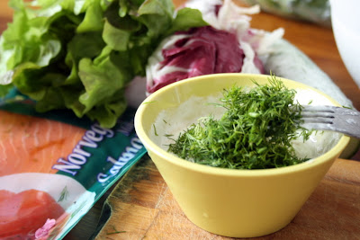 frunze (rucola, salata, radicchio) + cateva felii de castrvete + cateva fasiute de somon afumat + un ou fiertdressing din 2 linguri de iaurt dietetic + 1 lingura ulei de masline extravirgin + un pic de hrean ras + marar tocat + sare & piper