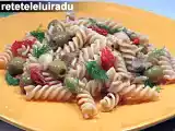 Ingrediente: 150 g paste scurte 2 cutii de ton in apa 200 g telemea sau feta 100 - 150 g masline 5 - 6 rosii cherry 3 linguri pasta de ardei 1 ceapa 2 - 3...