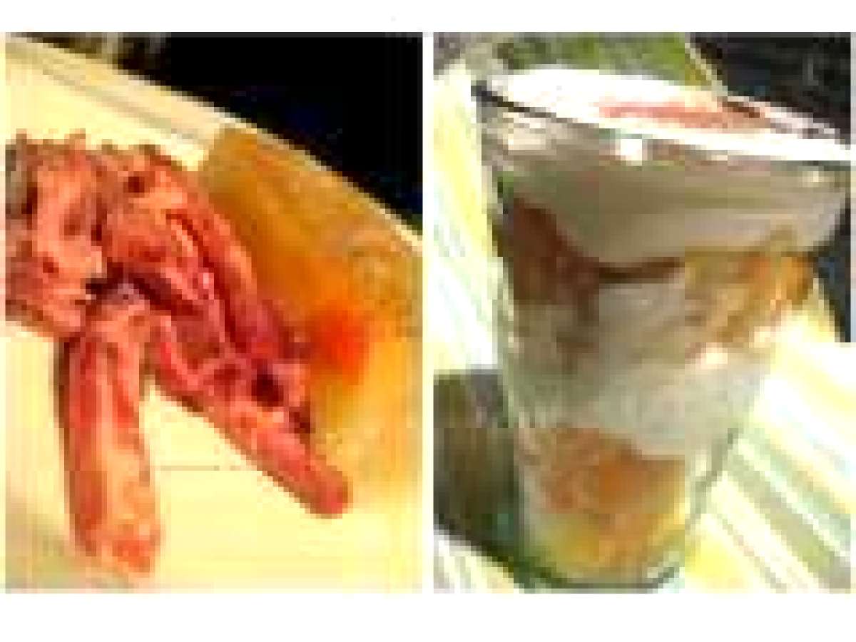 E, in rest clar, am amestecat, fructele curatate, spalate, decojite, ciopartite, cu coniecel si zeama de mandarine, am zbuciumat (cum era mai aia, zguduit, na ca imi scapa, vazui in niste exprimari recente) smantana cu zahar pana s-a facut frisca, am pus straturi, na.