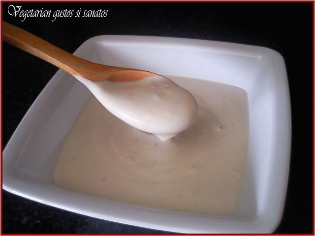 Es una salsa de soja muy rapida, que se alabora de tofu y leche de soja. Esta muy buena con pimiento relleno, sarmale, incluso con pasta. El sabor se lo damos nosotros, yo no he añadido ningun sabor, teniendo el tofu sabor de olivas. Se pude añadir ajo... lo que nosotros queremos, tambien depende con que lo quieremos consumir.