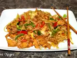 Ingrediente: 2 piepti de pui fara piele si dezosat , taiat cubulete o punga de taitei de orez (250 g) 2 lingurite de ulei de susan 2-3 linguri de pasta de...