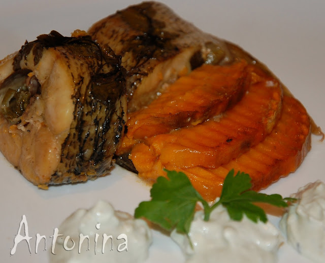Stiuca la cuptor, cu garnitura de cartofi dulci