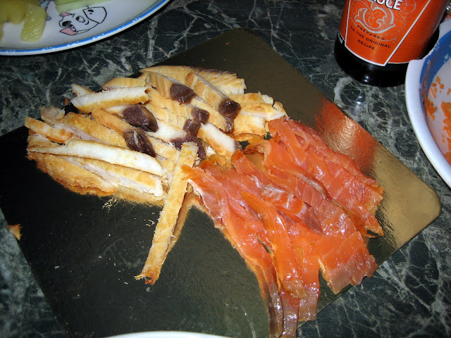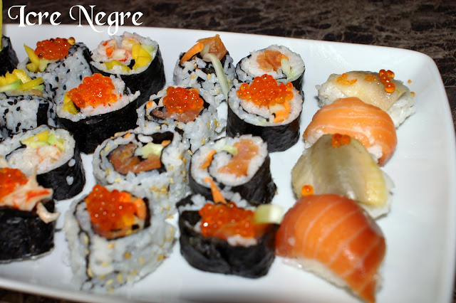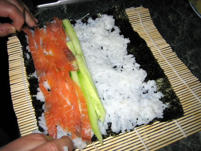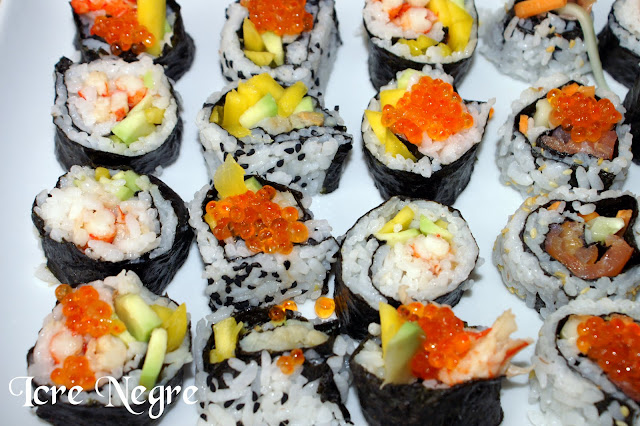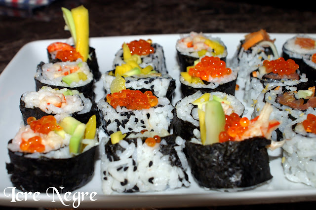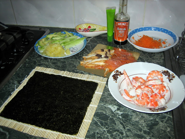 numarul 4: ingrediente diverse cum ar fi: creveti (fierti), somon (crud sau fume), ton (crud), peste afumat (eu am folosit macrou, morun, scrumbie...), avocado (chiar taiat foarte subtire si pus peste amestecul de orez si alte ingrediente), mango, ananas, morcov, castravete, ciuperci shitache, ardei gras rosu sau galben (pentru coloristica preparatului) etc.
