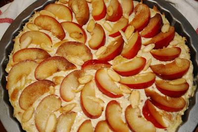 In sfarsit, asamblarea: am intins aluatul si l-am pus in forma de tarta unsa cu unt, apoi l-am uns cu gemul meu aromat, deasupra am pus umplutura cu migdale, si on top of that, prunele ramase, taiate in felii.