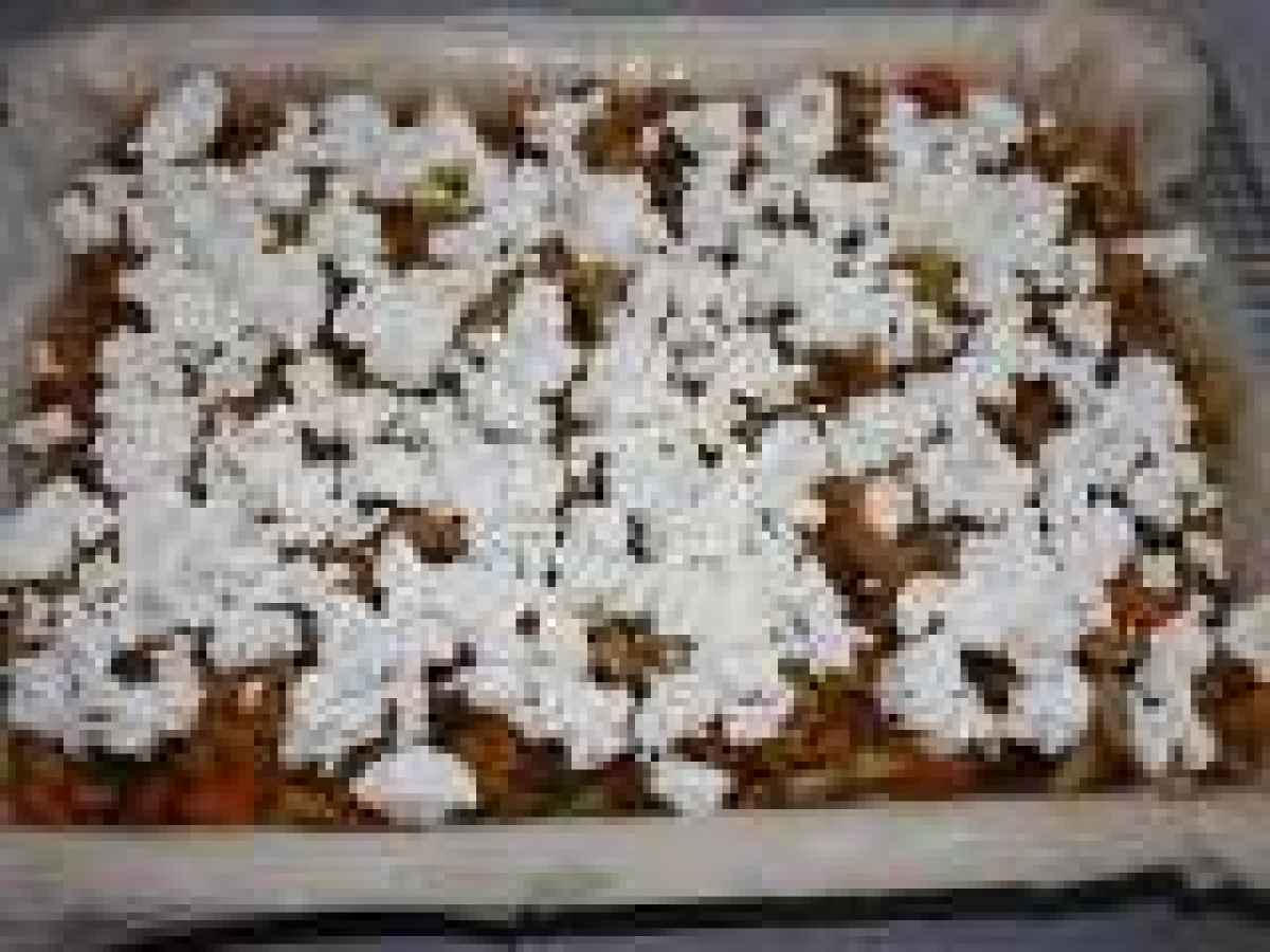 Intre timp ca sa nu stati degeaba, se pregateste intr-o tava putin mai mica decat cea de la cuptor, foile se intind una peste alta cu putin ulei din acela in care ati rumetit usturoiul, cu o pensula, sa nu puneti foarte mult, intindeti asa cat sa acopere toata suprafata foii de placinta, dar nu sa facem un stat de ulei, te joci asa cu 7-8 foiapoi puneti compozitia racita de legume, as vrea sa aveti grija ca dovleacul sa fie moale, el se face ca un piure, deasupra legumelor se adauga telemeua smaramitata cu mana. Se baga la cuptor timp de 25 min. pana marginile se fac maronii.
