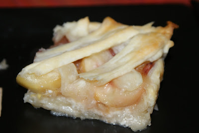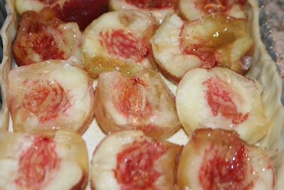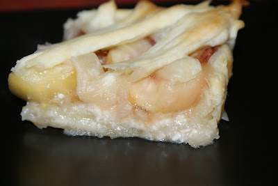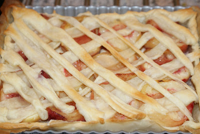 Imi plac tartele, ce pot sa spun?! Si pentru ca mi-a ramas foietaj ieri, iar cateva piersici albe extrem de parfumate si gustoase incepeau sa se inmoaie din ce in ce mai mult si imi era mila de ele sa le las sa se strice, am pus cateva jumatati deasupra unui foitaj uns cu smantana dulce, am turnat un pic de miere si zahar vanilat deasupra si am acoperit cu restul de foietaj ramas. Dupa 20 de minute la cuptor a iesit o tarta dulce-acrisoara extrem de buna!