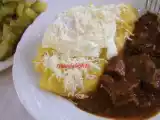 Ingrediente: 1 kg carne de porc; 50 ml ulei; 2 foi de dafin; 10 ? 15 boabe de piper; 2 cani cu apa; 1 pahar cu vin rosu; 3 linguri pasta de rosii; 1 capatana...