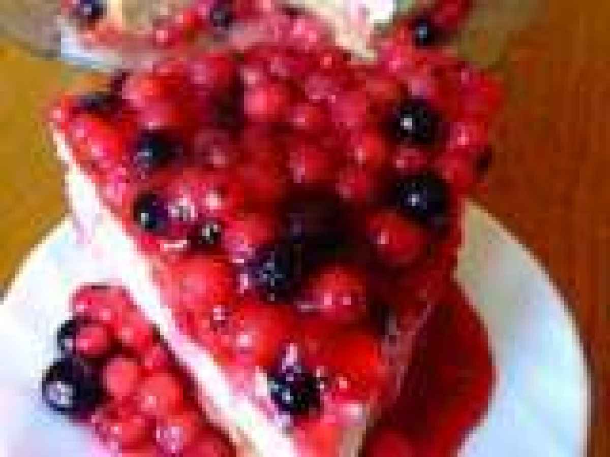 Dupa doua ore am acoperit partea de sus cu coacaze negre si rosii - congelate....(eu am folosit cca 600 g ) , am preparat un jeleu dintr-un plic de tort gelee rosu (indicatiile sunt pe plic ) si l-am turnat peste coacaze.
