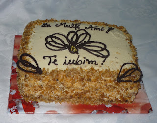 Pentru ca s-a vrut un tort mai micut (a avut 2 kg) am facut un singur blat si am renuntat la crema de ciocolata. Vreau sa va zic ca blatul si cremele sunt dementiale. Am mancat marginile din blat si era atat de bun si de pufos, ca nu prea l-am insiropat.