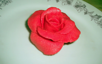 Ieri fiind singura acasa, am zis ca ar trebui sa mai incerc o data sa modelez niste trangafiri si solutia cea mai simpla a fost pasta de lapte praf.