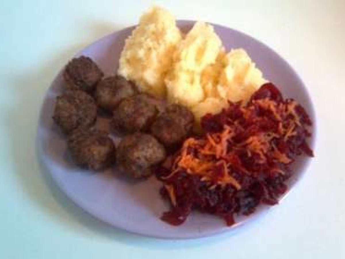 Chiftelute cu marar, piure si salata de sfecla Felul principalUșor1 h 10 m Trimite unui prieten Printează pagina Adresează o întrebare autorului Postează o poză cu rețeta gătită de tine Ingrediente 4 Pentru chiftele: * 500 gr carne de porc, 200 gr carne de manzat, 4 catei de usturoi, o legatura de marar, sare, piper, 3 felii de paine, 1 ou, ulei pt prajit. Pentru piure: * 5 cartofi, 50 gr unt, 50 gr lapte, sare. Pentru salata: * 1 sfecla rosie, 1 morcov, ulei, otet, sare.